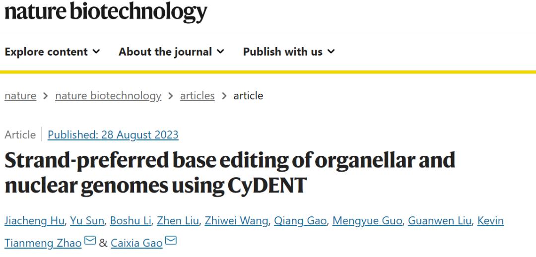 基因组编辑可以对生物体遗传信息进行精准、高效的修饰,已经成为生命科学领域的一项颠覆性技术。通过融合nCas9(切口酶形式的Cas9)与脱氨酶,刘如谦(David Liu)团队先后开发出了具有里程碑意义的胞嘧啶碱基编辑系统(CBE)及腺嘌呤碱基编辑系统(ABE),将以CRISPR为代表的基因组编辑技术引入了“精准编辑”的全新时代。2023年8月28日,中国科学院遗传与发育生物学研究所高彩霞团队联合北京齐禾生科生物科技有限公司,在 Nature Biotechnology 期刊发表了题为:Strand-preferred base editing of organellar and nuclear genomes using CyDENT 的研究论文。