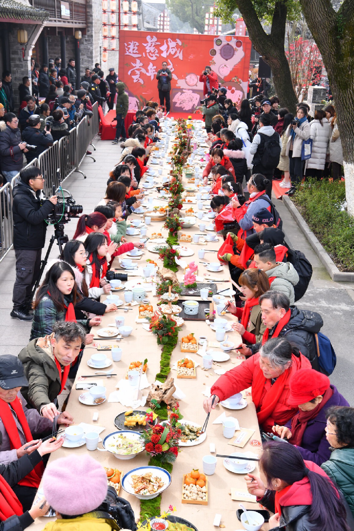 “糖炒炒,油爆爆,吃得嘴角生大泡。”“荠菜肉丝炒年糕,灶君菩萨伸手捞。”今年春节假期前,慈城古县城又久违地摆起了长桌宴。慈城商铺的大厨纷纷亮出拿手好菜,现场制作几十道年糕菜品,为游客献上了一场年糕盛宴。紧接着,慈城年糕厨神大赛“如约而至”。糖桂花年糕、海鲜荠菜炒年糕、宁式鳝丝炒年糕、苔菜脆皮年糕、大白菜冬笋肉丝炒年糕、墨鱼汁炒年糕、白蟹炒年糕……大厨们动作行云流水,颠锅、调味绝不拖泥带水,灶台上旺火翻腾,各类年糕美食悉数上桌。慈城又一次以年糕为主题,款待来自四面八方的市民游客,共同感受古城传统但烂漫的烟火气。
