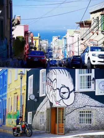 五彩斑斓的智利街道,图中为瓦尔帕莱索 / 图片由受访者提供圣地亚哥是美洲最大的城市之一,它的浪漫、抒情与大量盛开的花朵一样毫不羞涩。走在圣地亚哥的街头,四处色彩斑斓,行人穿着乱七八糟的花衣服,坦荡地裸露着丰满结实的肉体。