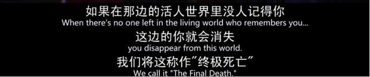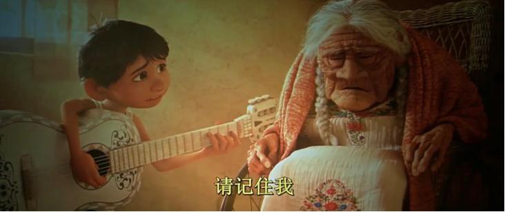 《寻梦环游记》截图,“请记住我/虽然我要说再见了/记住我/希望你别哭泣”