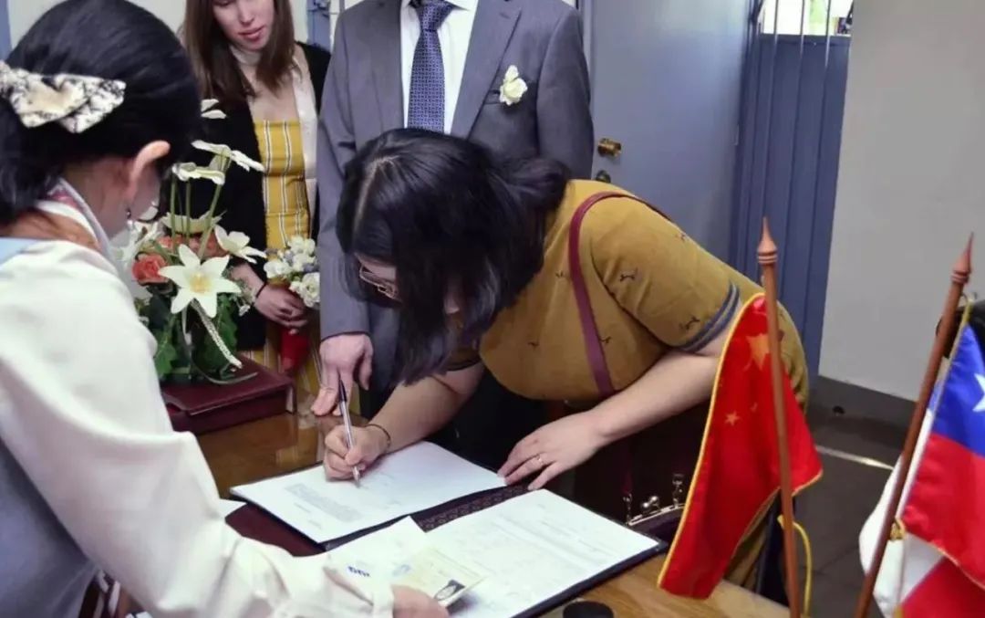 办理结婚登记,桌上放着中国国旗和智利国旗 / 图片由受访者提供婚礼公证时,工作人员捧着一本册子,用温柔而严肃的语气对我们说: