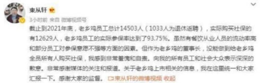 老乡鸡董事长束从轩坐不住了,亲自录制视频在微博进行回应。束从轩表示,截止到2021年底,老乡鸡员工总计14503人(1033人为退休返聘),实际购买社保的有12629人,老乡鸡员工的实际参保率达到了93.75%,“3年累计1.6万未缴”的说法存在重复计算的问题。