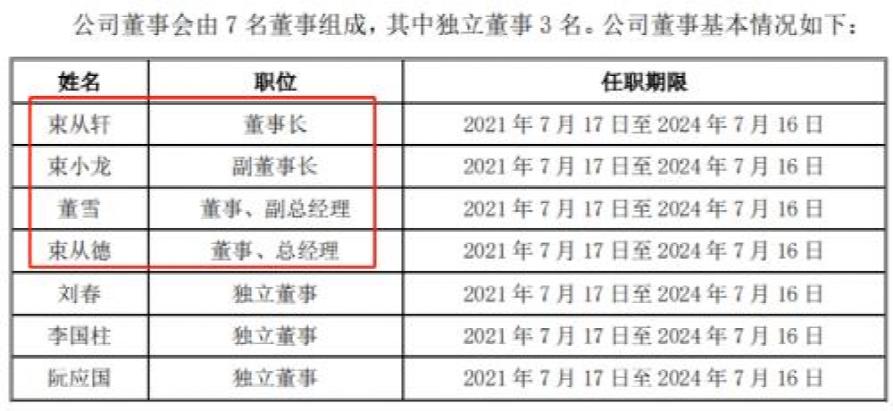 而一家五口除了女儿束文,也都是老乡鸡董事和高级管理人员:束从轩是董事长,妻子张琼是副总经理,儿子束小龙是副董事长,儿媳妇董雪是董事兼副总经理。7名董事会成员除去3名独立董事,有3名来自束从轩家族,另外1名董事束从德姓氏和名字看上去也很“近”,不过招股书没有披露其与束从轩家族有亲属关系。