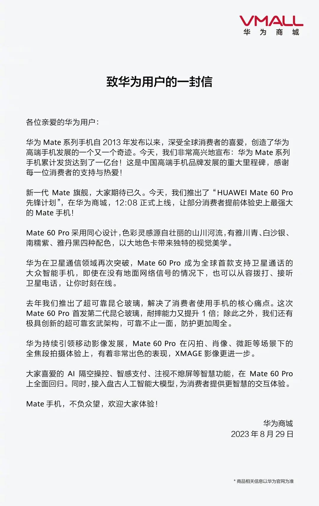 在一封《致用户信》中,华为称,华为Mate系列手机累计发货达到一亿台,为此,华为于今天12:08推出“HUAWEI Mate 60 Pro先锋计划”,让部分消费者提前体验。