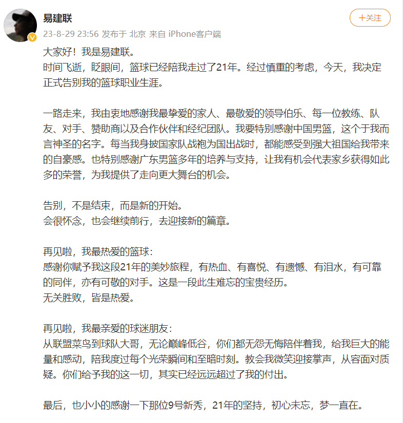 8月29日深夜,中国男篮球员易建联通过个人社交媒体宣布退役,结束21年职业生涯。