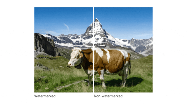 SynthID 目前可以为谷歌的文生图模型 Imagen 生成的图像添加水印,并且在视觉上难以察觉。如下图所示,有无水印的图像看起来没有区别: