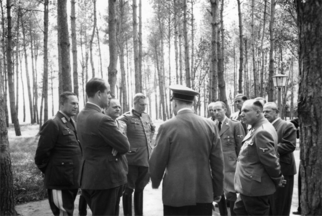 1942年8月,阿道夫·希特勒在乌克兰的沃尔夫斯堡大本营,身边是军备部长阿尔伯特·施佩尔(左)和党务中心领导人马丁·鲍曼(右)。短短40年,德国走完了西欧百年的工业化道路,在一战前,发展成为欧洲最大、世界第二大经济体。在国际上,德国加紧殖民扩张,大力发展公海舰队,挑战英帝国的海上霸权。1914年第一次世界大战爆发,德国4年后战败,与西方签订了《凡尔赛条约》,从一个有世界影响力的大国,沦落成为欧洲二三流国家。