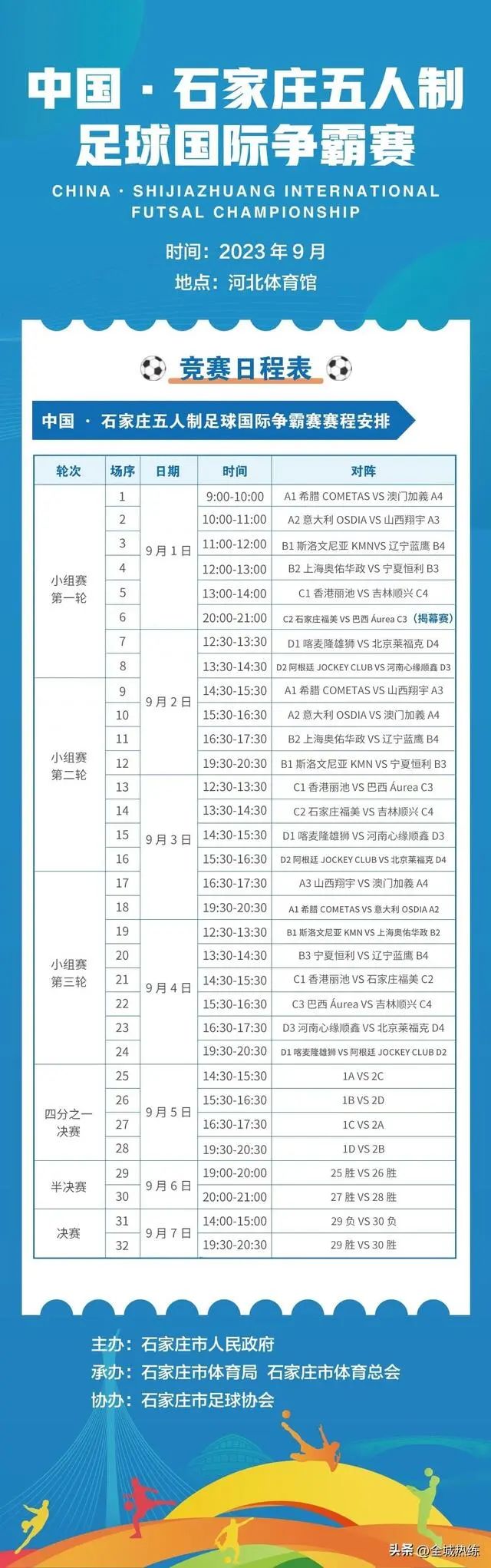 据介绍,中国·石家庄五人制足球国际争霸赛的赛事集竞技性、观赏性于一体,以赛为媒,以赛名城,以体育精神激发城市发展活力。通过赛事拓展城市国际影响力,生动展现石家庄开放、包容、时尚、活力的城市形象。根据赛制,比赛共进行6轮32场比赛,揭幕赛于9月1日19:30举行,由石家庄福美足球队对阵来自巴西里约热内卢的对手。