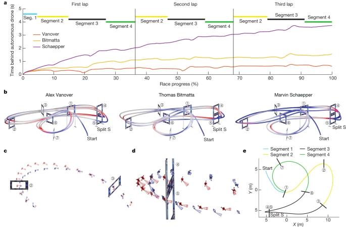 下图 1a 是这次比赛的赛道,Swift 不仅赢得了与人类冠军的比赛,还创造了最快的比赛纪录。这项工作是移动机器人和机器智能领域的一个里程碑。