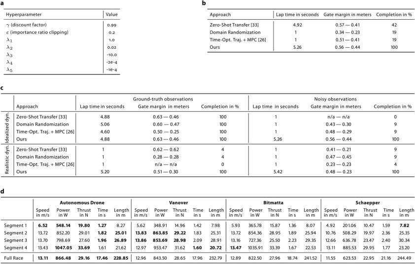 研究团队仔细分析发现:在起飞时,Swift 的反应时间较短,平均比人类飞行员早 120 毫秒起飞;Swift 的加速也更快,进入第一个竞赛门时速度更高。在急转弯时,如图 4cd 所示,Swift 的动作更加紧凑。