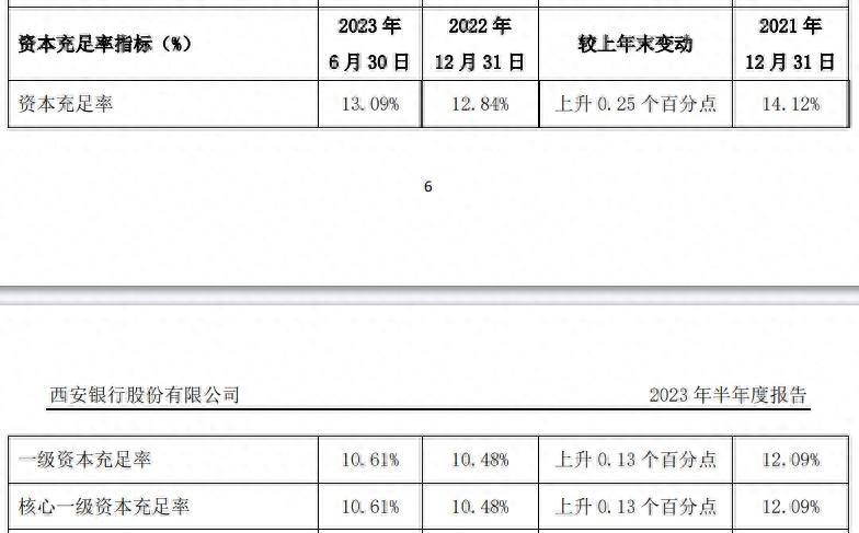 截至2023年6月30日,西安银行资本充足率113.09%,较上年末上升0.25个百分点;一级资本充足率10.61%,较上年末上升0.13个百分点;核心一级资本充足率10.61%,较上年末上升0.13个百分点。