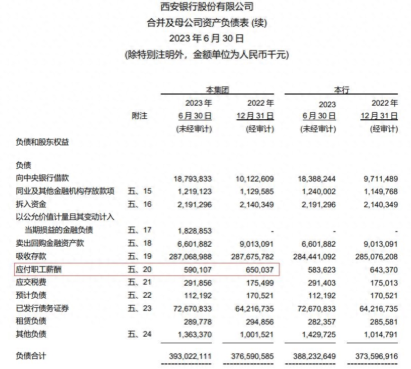 截至今年6月末,西安银行应付职工薪酬5.90亿元,上年末为6.50亿元。