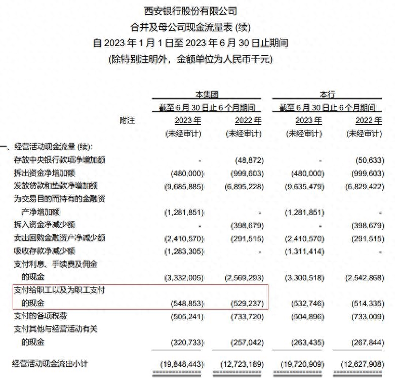 今年上半年,西安银行支付给职工以及为职工支付的现金为5.49亿元,上年同期为5.29亿元。