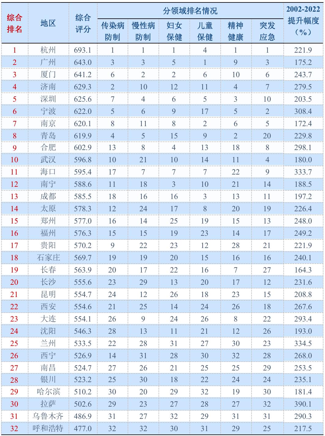 32个重点城市公共健康治理能力排名:杭州、广州、厦门排名前三