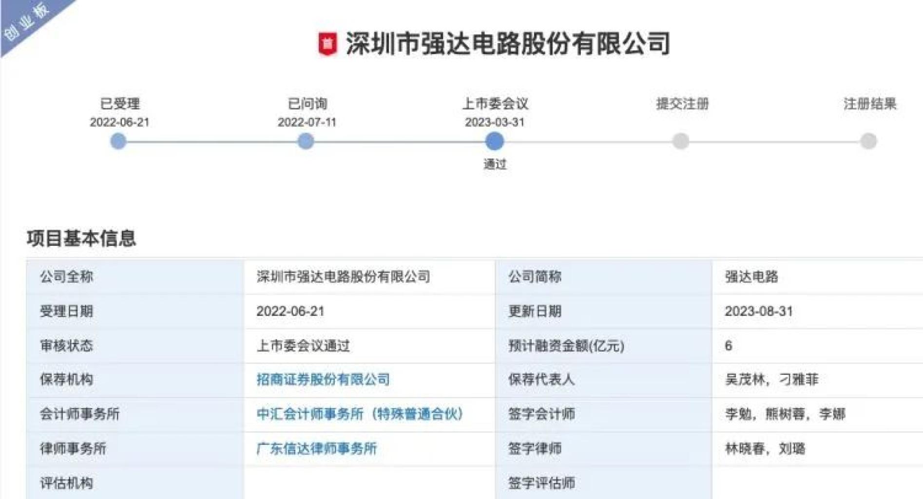 深圳证券交易所网站显示,深圳市强达电路股份有限公司(以下简称“强达电路”)8月31日发布第二轮问询函回复,并更新2023年半年度财务数据。IPO进程显示,强达电路于2022年6月21日已受理,拟创业板上市,2023年3月31日首发获通过。本次发行的保荐机构为招商证券。
