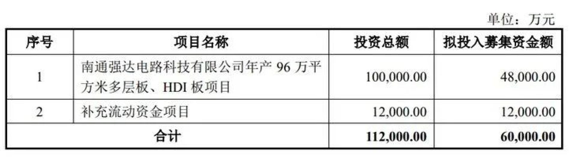 据招股书,强达电路本次拟在深交所创业板公开发行股票数量不超过1884.40万股(不含超额配售选择权),拟募集资金6亿元,分别用于南通强达电路科技有限公司年产96万平方米多层板、HDI板项目,以及补充流动资金项目。