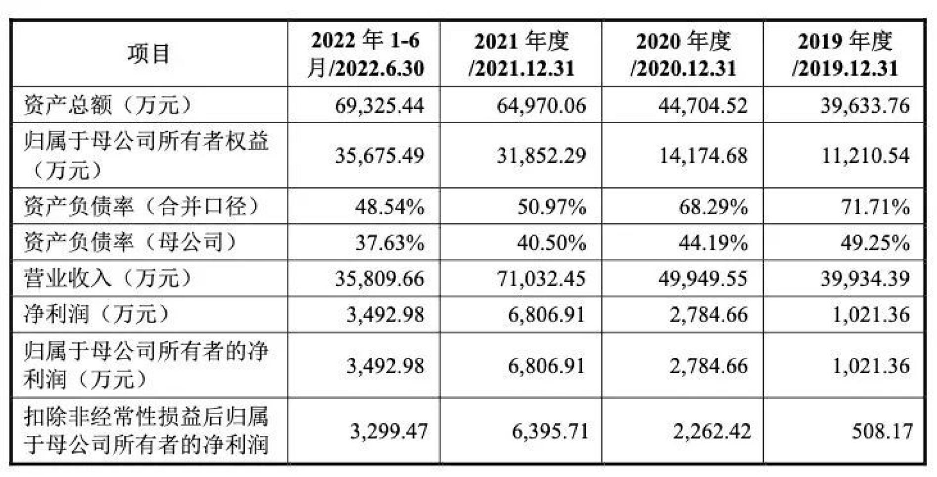 报告期内(2019年至2022年1-6月),公司主营业务收入分别为3.92亿元、4.91亿元、6.91亿元和3.44亿元,扣除非经常性损益后归属于母公司所有者的净利润分别为508.17万元、2262.42万元、6395.71万元和3299.47万元。