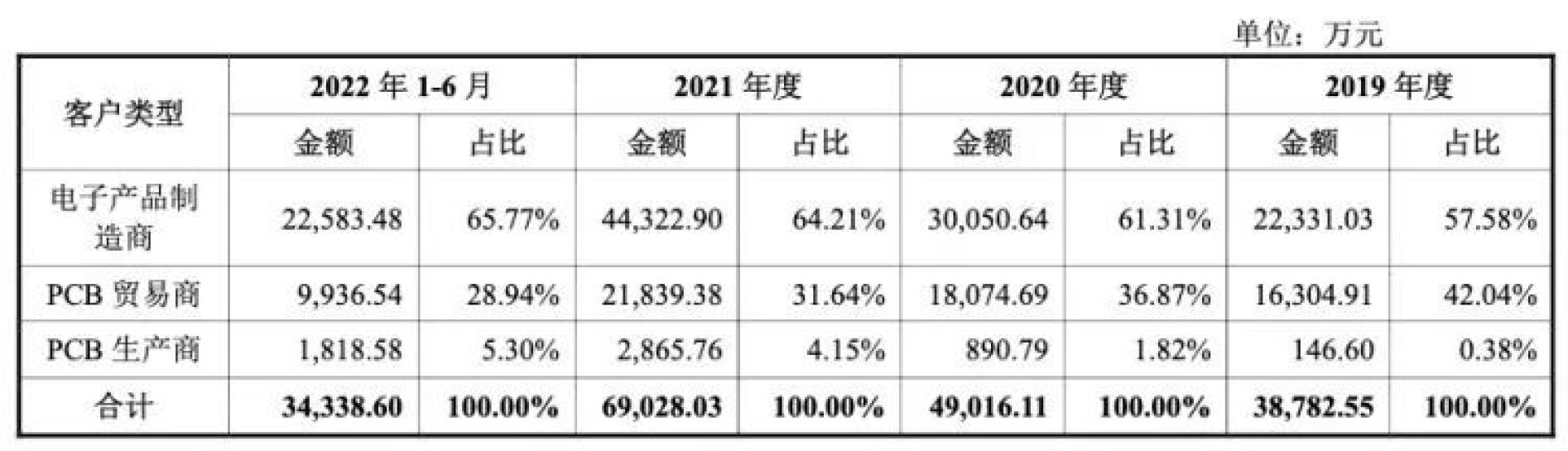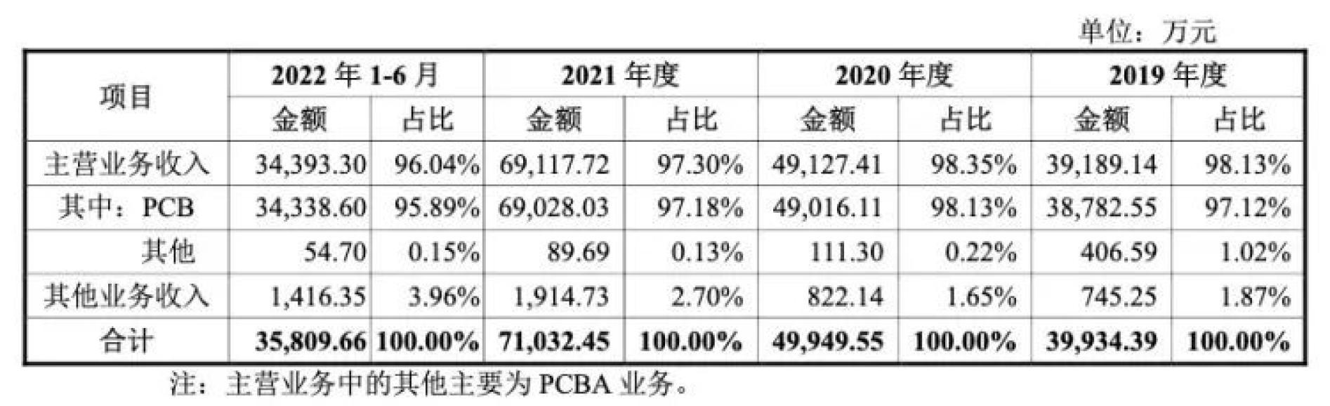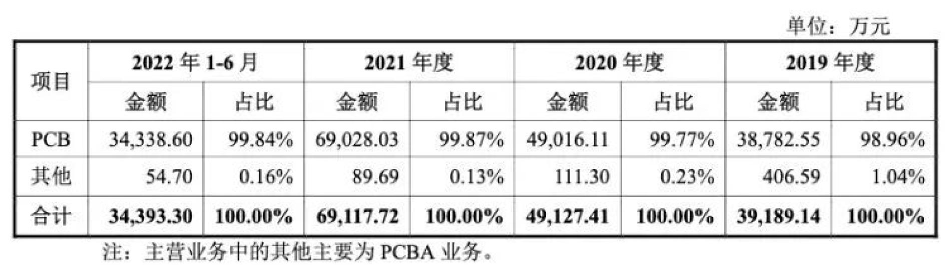 报告期内,公司主营业务收入主要源于PCB销售收入,其收入占主营业务收入的比重为 99.61%左右。公司PCB产品按订单面积分为样板、小批量板和大批量板,按产品层数分类为单/双面板和多层板。