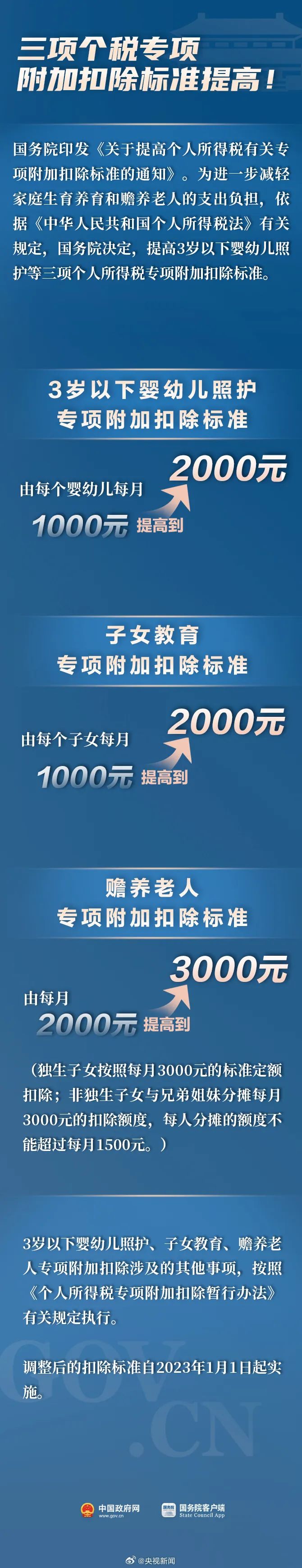国务院日前印发《关于提高个人所得税有关专项附加扣除标准的通知》,决定提高3岁以下婴幼儿照护、子女教育、赡养老人个人所得税专项附加扣除标准。(详情)