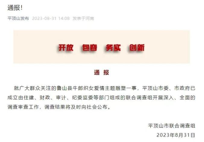 就广大群众关注的鲁山县牛郎织女爱情主题雕塑一事,平顶山市委、市政府已成立由住建、财政、审计、纪委监委等部门组成的联合调查组开展深入、全面的调查审查工作,调查结果将及时向社会公布。