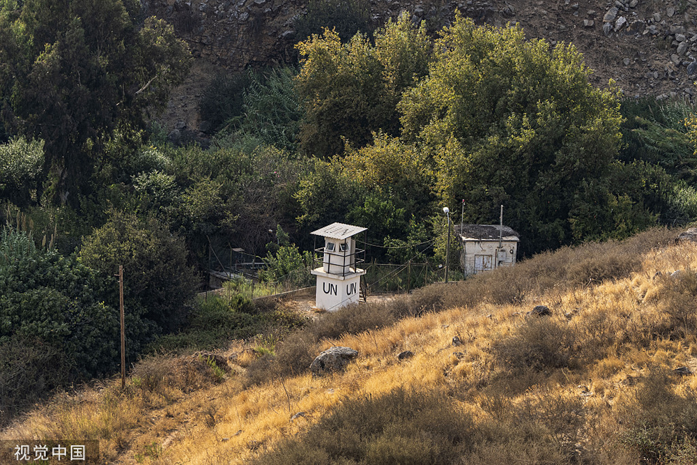 当地时间2022年10月14日,盖杰尔村处的联合国边境围栏的望塔。盖杰尔村地处以色列实际控制的戈兰高地与黎巴嫩交界地区,横跨联合国划定的黎以控制区分界线。视觉中国 资料图