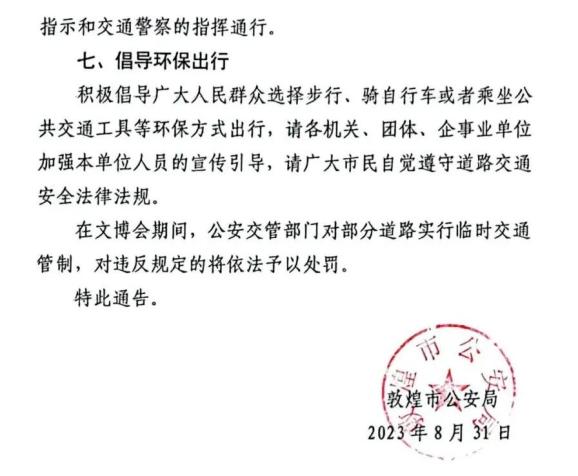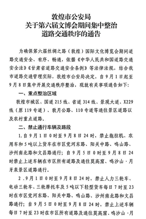 原标题:《关于第六届敦煌文博会期间集中整治道路交通秩序的通告》