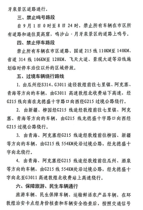 自9月1日0时至8日24时,禁止所有车辆在市区所有道路和通往莫高窟,鸣沙山·月牙泉景区的道路上鸣号。