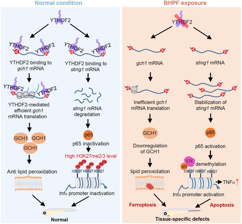 该研究发现一种常用的双酚A替代物——双酚芴(fluorene-9-bisphenol,BHPF),高频存在于孕妇人群血样中(14%),并能在动物模型中导致多重发育缺陷。机制上,双酚芴的应答分子YTHDF2能通过其多重的m6A调节功能,在不同组织器官中调控两种完全独立的细胞死亡通路,以造成组织特异性损伤。伴随此新机制的阐明,我们也提出了应对双酚芴损伤的潜在临床处置方法。该研究除了具有发现了全新m6A对细胞死亡调控模式的分子理论意义,鉴于双酚芴的广泛使用,且已经能在地表水以及人群检体中被测得,对环境、人类以及动物的健康都具有重大意义。