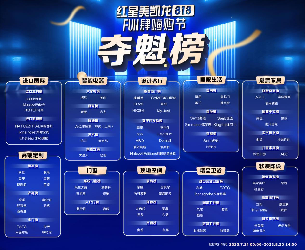 本次调研问卷针对近期818FUN肆嗨购节大促期间热销的TOP100家居品牌进行了口碑调研,品牌共分为进口国际、智能电器、设计客厅、睡眠生活、潮流家具、高端定制、系统门窗、顶地空间、精品卫浴、软装陈设这十个大类。
