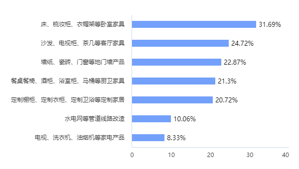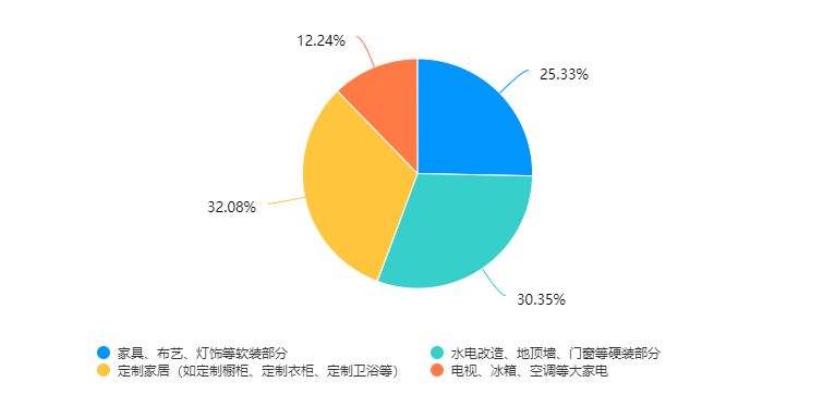 家装家居的花费主要分为水电门窗等硬装、家居灯饰等软装、包括橱柜卫浴在内的定制家居和电视冰箱等大家电这几类,《家居行业消费调研》显示,有约32.08%的人群愿意把最大一笔投入花在定制家居,紧跟其后的是硬装部分,占比约30.35%。和过去硬装修占据大头的情况不同,随着生活水平的提高,人们更在乎家居空间的设计感和整体性,在定制家居方面的投入反超硬装修。