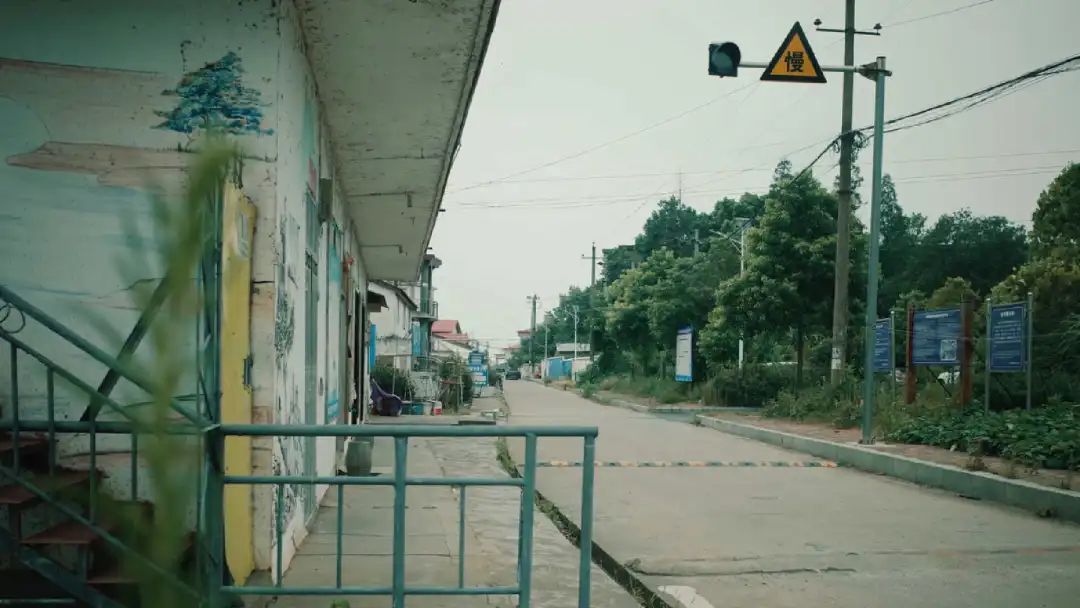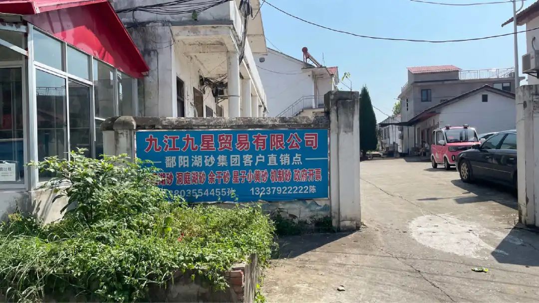 渔村不大,只有一条主干路,靠细长的堤坝支撑起来的173县道是外界唯一通往蛤蟆石渔村的陆路,沿路有很多工厂,水泥厂、水产厂、钢筋器材,不远处就是濂溪区的产业园,站在村口还能瞧见大烟囱往上冒烟,所有机器撞击的声音都从那里传来。入口码头处贴着褪色泛白的标语牌,“护鸟光荣”“爱鸟护鸟,保护环境”,彰显时代感的环保宣言。村路两旁的电线杆挂有感应式喇叭,车辆通过便自动播放:“鄱阳湖濂溪区水域从2020年1月1日零时起实行禁渔……”,声音环绕着整个渔村。紧贴居民楼的围墙一侧遍布着砂石贸易公司的招牌,“采砂管理、砂石交易、政府开票……”,而另一侧围墙喷漆着政府宣传“不可下水”的警告、保护江豚的彩绘图和一则用不浓的墨色颜料书写的《蛤蟆石记》。