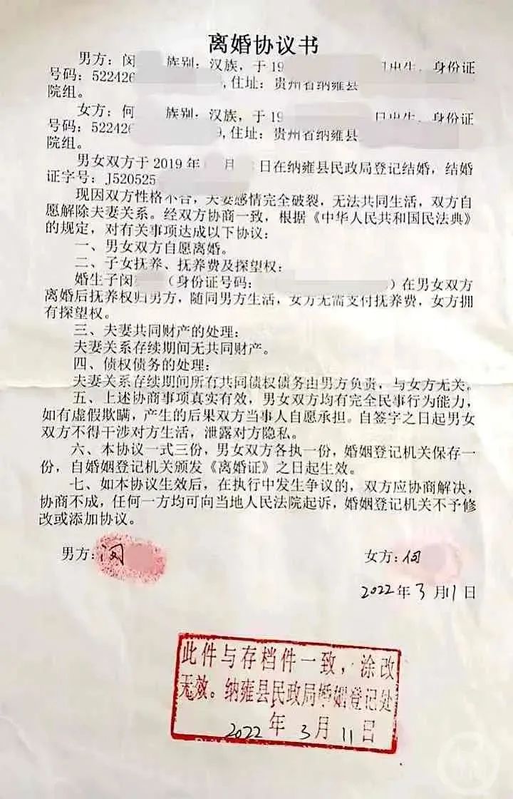 闵某何某的结婚证。 图丨受访者供图两个月后的2022年3月11日,闵某向妻子提出离婚。据两人在纳雍县民政局签订的离婚协议显示,双方自愿解除夫妻关系;婚生子抚养权归男方,随同男方生活,女方无需支付抚养费,且拥有探望权;两人夫妻关系存续期间无共同财产,所有共同债权债务由男方负责,与女方无关。协议还确认,如本协议生效后,在执行中发生争议的,双方应协商解决,协商不成,任何一方均可向当地人民法院起诉,婚姻登记机关不予修改或添加协议。