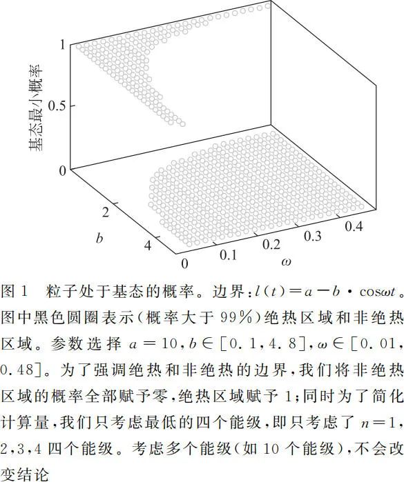 图 1 展示了基于前文所约定的绝热判定条件下,当 a = 10 时,初始处于基态的粒子以后时刻也保持在基态的概率随参数 b 和 ω 的变化,如黑色圆圈所示。通过观察数值模拟图像,容易发现在 b ∈ [2.1,4.5] 参数范围内,系统均是绝热演化的。也就是说当边界低频周期运动时,阱内粒子有更高的概率处于绝热状态。