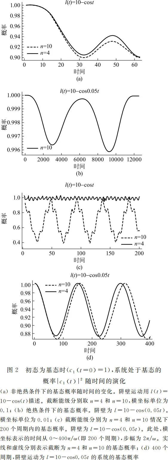 在图 2(a)和图 2(b)中,我们分别选取了非绝热和绝热条件各一组,绘制了基态概率演化图像。在 2(a)中,边界为 l ( t ) = 10-cosωt。系统的概率在演化结束时刻无法回到初始状态(基态),而是以 90% 的概率处于基态,小于 99%。在图 2(b)中,边界函数 l ( t ) = 10 - cos0.05t;系统概率在整个演化过程结束时回到初态。图 2(a)还展示了对于相同运动的边界,能级截断对计算结果的影响。通过对比截断到 n = 4 和 n = 10 能级的结果,发现:截断带来的误差可以忽略不计。