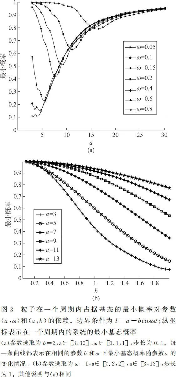 为了更具体地展示基态绝热演化随驱动振幅、频率和初始阱宽的关系,我们绘制了粒子演化一个周期时,处于基态的概率随参数的变化关系。图 3(a)展示了基态概率在一个周期内的最小值随着不同参数 a 和 ω 的变化情况。图像中边界为 l ( t ) = a - 2cosωt,曲线从上到下依次代表参数 ω 从 0.05~0.8。可以看出,当 a 增加时,对于 ω < 0.6,最小概率先降低再增加。对于 ω > 0.6,最小概率单调递增。图 3(b)展示了最小基态概率在一个周期内随不同参数 a 和 b 的变化情况。曲线由上到下分别表示了 a 从 13~3。随着振动幅度 b 增大、边界初始长度 a 减小,最小概率越来越小。