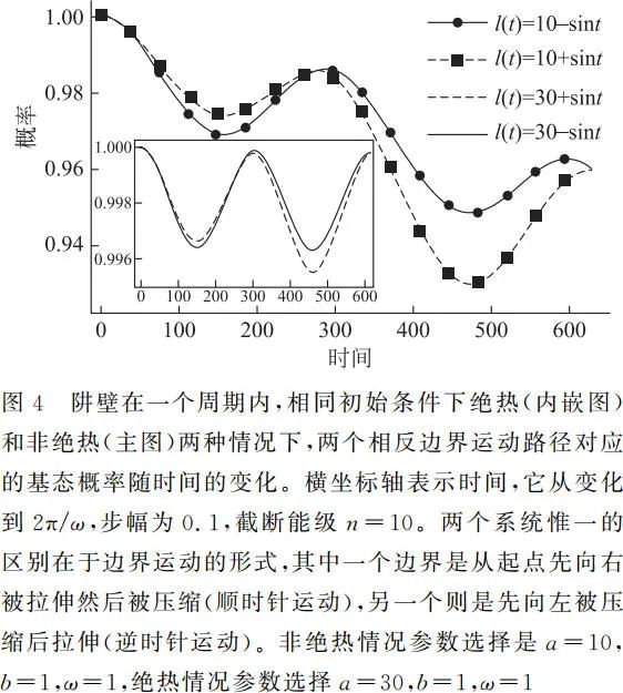 根据图 1,选取绝热和非绝热两组适当的参数,截断能级选为 n = 10。图 4 给出了 l ( t ) = a ± b sint 描述的两种不同运动模式在相同初始条件下的演化结果。在图 4 的小图中,可以看到基态最小概率大于 99.3%,因此两个系统满足绝热条件。两条曲线虽然在一个周期内多次分开,但是在周期的结束时刻重合,同时回到初始状态。在图 4 主图中,基态最小概率小于 94%,系统是非绝热的。虽然主图中的两条曲线在一个周期的结束时刻重新重合,但是结束时刻的基态概率值并不等于 1,这也意味着系统没有重新回到基态。同时,绝热情况下两条曲线的最小基态概率差值小于 0.001;而在非绝热情况下,这个差值最大可以达到 0.02——显然,非绝热情况下两种运动模式的差异更大。