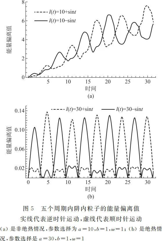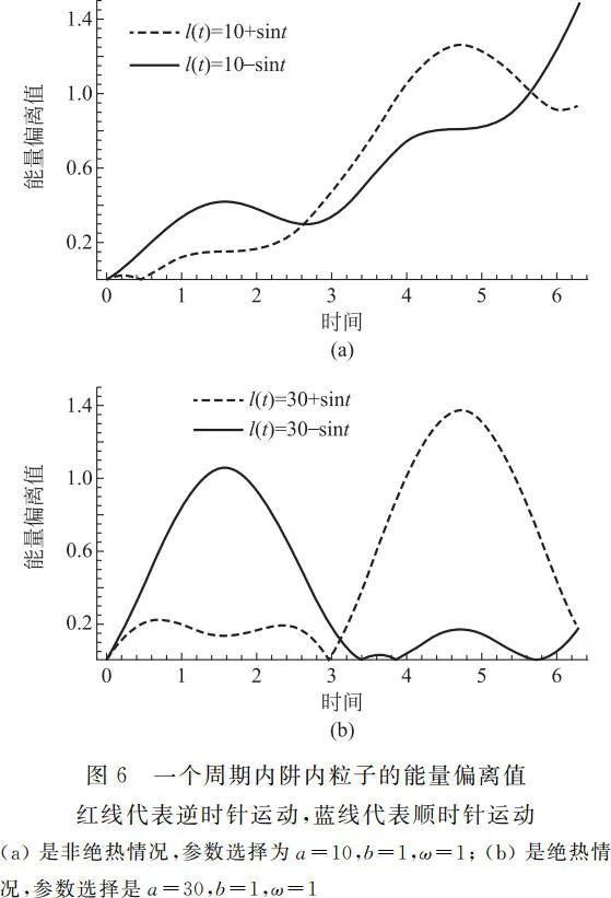 图 5 和图 6 中展示了阱中粒子在五个周期和一个周期内的绝热和非绝热两种情况下的能量偏离值。通过对比图 4 和图 6,我们发现阱内系统的能量离散值和系统的基态概率变化有相同的演化趋势。以 l ( t ) = 30 + sint 为例,结合图 6 和图 4 内嵌图来说明系统的能量偏离值和跃迁概率的关系。在 t ∈[0,π / 2]时间内,边界向右侧扩张,阱内波包扩散。整个阱内系统的能量期望值降低,能量偏离值和跃迁概率均增大。在 t = 2π / ω 时间内,边界持续收缩,阱内波包被持续压缩。整个阱内系统能量偏离值先减小后增大,阱内粒子基态概率跃迁概率先减小后增大。在 t ∈ [3π / 2,2π]时间内,边界又重新向右扩张,整个过程和 t ∈ [0,π / 2]过程相同。对于非绝热状态,我们可以发现在一个外部驱动周期的末时刻系统能量无法回到初始时刻,即系统能量偏离值不为零,因此非绝热情况下基态概率在末时刻显然不为 1。在更长的时间范围内,非绝热情况的系统内部能量偏离值更大,而绝热情况的系统内部能量偏离值变化在一定区域内变化。由此也可以解释图 2(c)中为什么非绝热情况要考虑更多的截断能级:因为对于非绝热系统,系统的偏离能量值更大,这意味着系统将具有几倍于初始时刻的能量,所以系统跃迁到高能级的概率增大,无法再像绝热时一样忽略,所以需要考虑更多的能级。