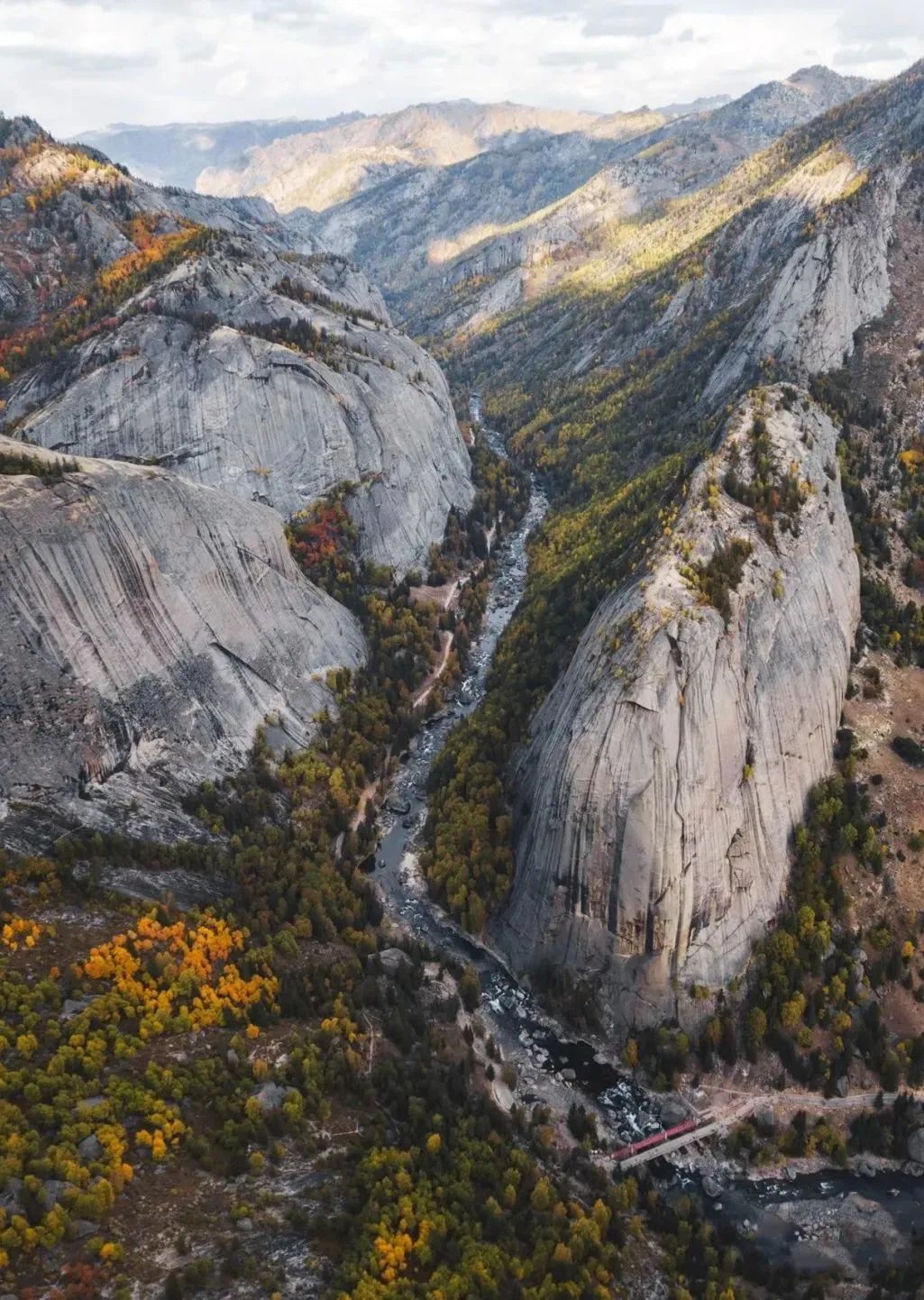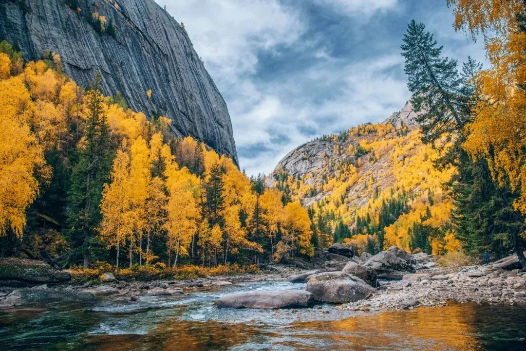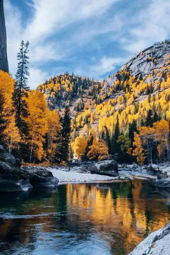 额尔齐斯大峡谷属于花岗岩地质,受冰川雪水的侵蚀,水流冲刷后形成了旖旎的峡谷风光。倘若你有时间,一定不能错过额尔齐斯河大峡谷这一场秋日的盛宴。大峡谷的秋,将夏日苍翠欲滴的山林,沾染出了漫山遍野色彩斑斓的美景。