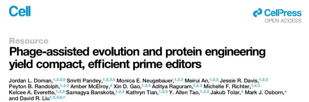 2023年8月31日,刘如谦团队在 Cell 期刊发表了题为:Phage-assisted evolution and protein engineering yield compact, efficient prime editors 的研究论文,对先导编辑(PE)系统进行了优化和改进,使其进化成更高效的基因编辑工具。