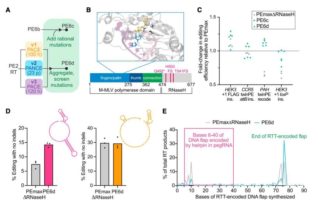 为了提高PE系统的编辑效率,刘如谦团队一直致力于不断优化和改进PE系统的每个部分。此前,研究团队已经优化了pegRNA和细胞对PE编辑的反应方式。在这项最新研究中,他们专注于改进PE系统的核心——逆转录酶。