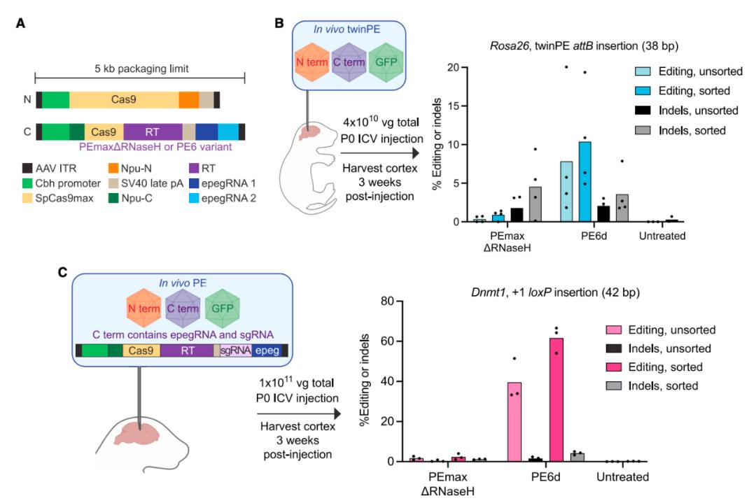 通过双AAV载体递送新型PE编辑器,研究团队能够将一长段DNA序列插入小鼠大脑皮层40%的细胞中,这比之前最先进的PE编辑系统提高了24倍!从不到2%的编辑效率发展为如今40%的编辑效率,这种巨大的差异足以支持这些新型PE编辑器在治疗应用中的发展。