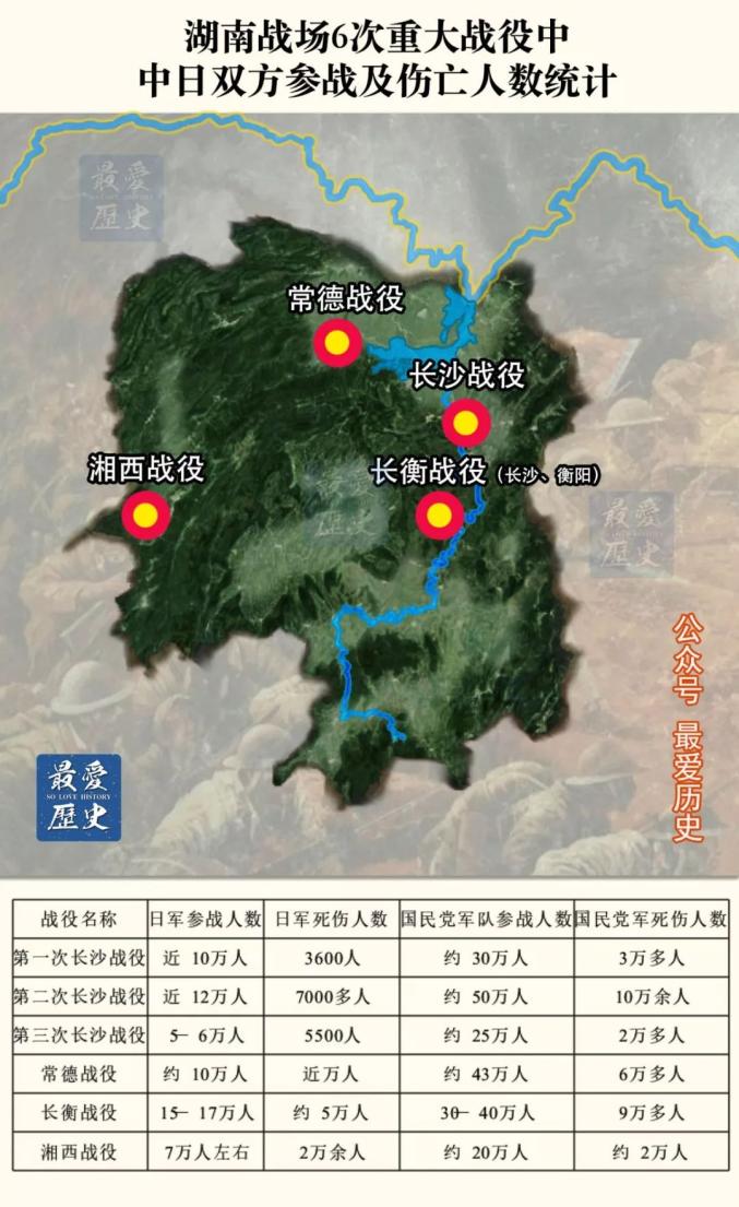 在湖南进行的6次大规模会战中,日军先后投入兵力60余万人次,伤亡20多万人,而湖南全省共伤亡人口260余万,其中死亡92万,毁坏房屋93万余栋。