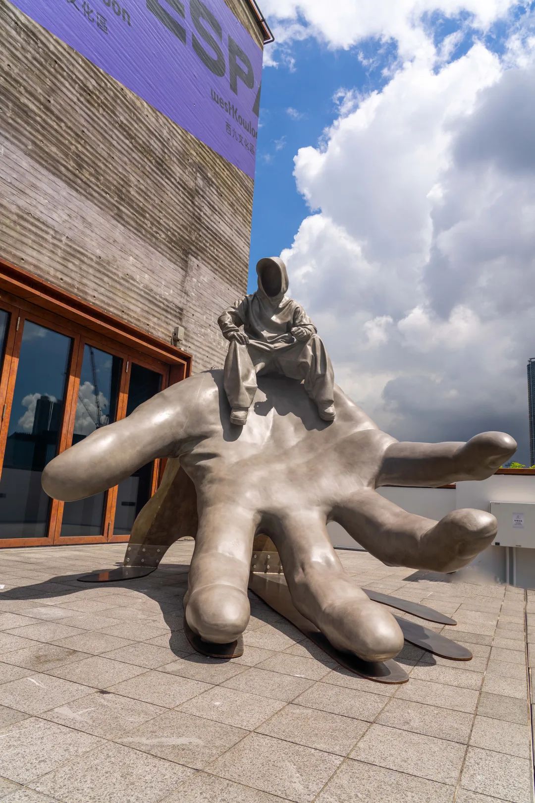最后推门而出,二楼的露台上是一个巨大的手型雕塑,与艺术家黄玉龙合作完成。这只手用刘德华的右手倒模而成,他曾因拍戏弄伤了小指,如果仔细看,雕塑的小拇指是歪的,是很特别的存在。