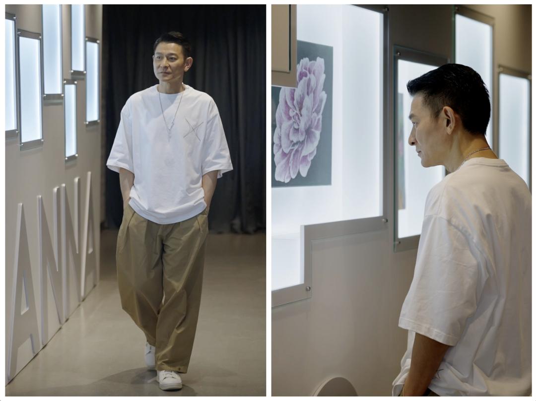开展当天下午,刘德华一分不差出现在我们约定的采访空间,身穿展览的白色t恤,和宽松卡其牛仔裤。因为常年食素健身,刘德华的身材保持得很好,精神头十足,没有人会觉得他已经62岁了。