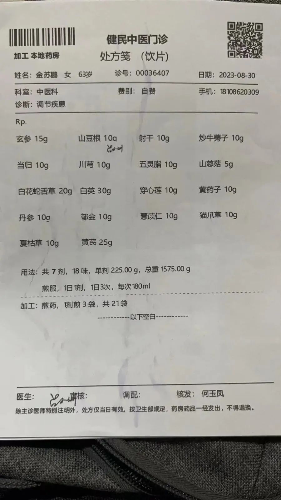 “医生望闻问切,诊断后说我母亲状态还不错,癌症也还早,唯一担心就是肾功能。”王女士说,诊断后医馆给其母亲开了7剂抗癌与身体调理的中药,一日1剂,一日3次,由医馆煎药,共21袋。“他们说7天后会有比较大的改善,我母亲自己身体就会有感受到变化。”