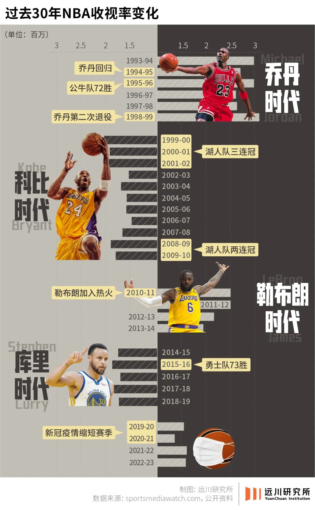 一边是“字母哥”安德托昆博的中国行遇冷,另一边2023年赛季创下了过去三十年NBA收视率的最低记录,收视率比1995年-1996年赛季乔丹的巅峰时代收视率下降了一半[18]。黄绿大战、勇骑争锋似乎已是男孩子冰封的记忆,唯一热出圈的巴特勒,也已然33岁,是库里时代的球星。