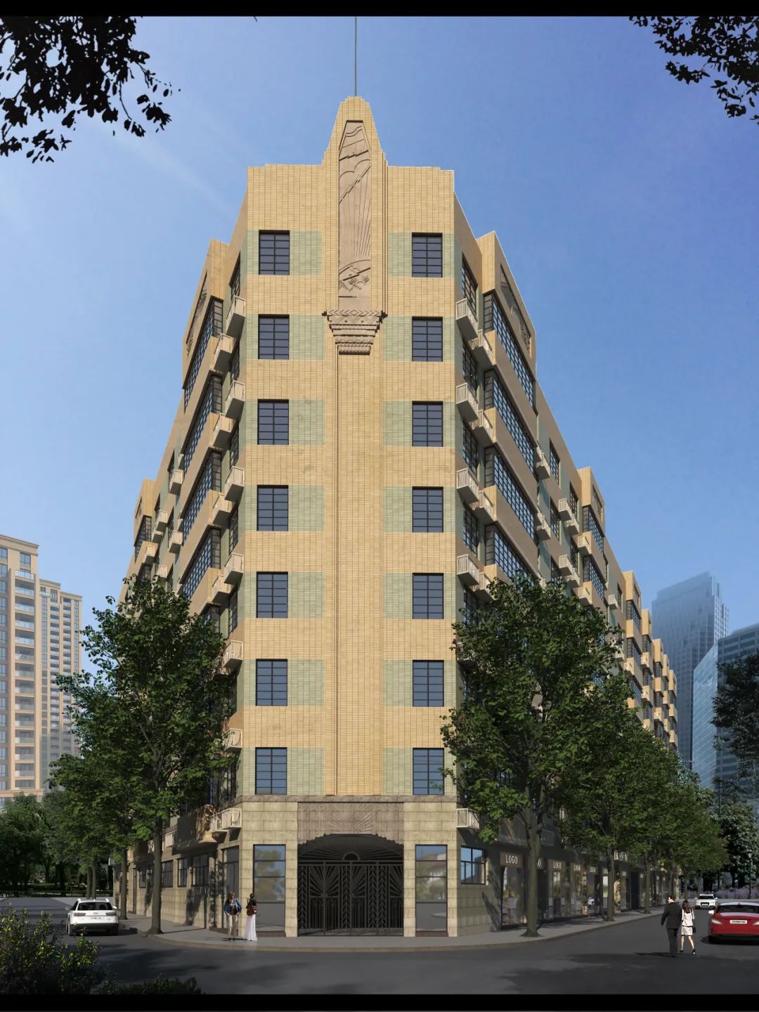 百年历史建筑“前世今生”南昌大楼与钟和公寓是两幢“转角公寓”,建筑形态因地制宜呈现楔形,互为呼应。南昌大楼楔端立面上突出的尖塔在视觉上极具标志性和吸引力,立面整体则以奶黄和浅绿的面砖水平分色铺贴,平直简约。