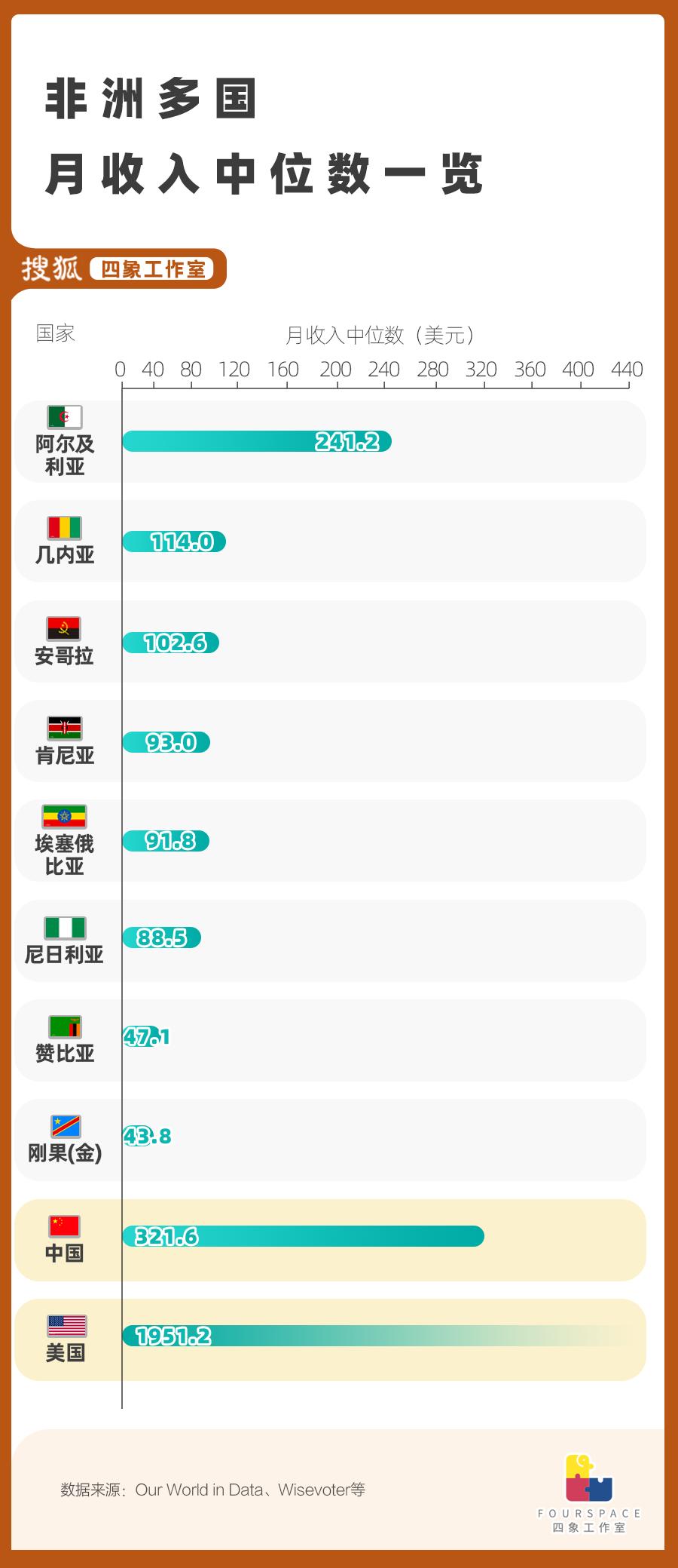 以国人驻扎较多的阿尔及利亚为例,当地的月收入中位数仅为241.2美元,低于中国的321.6美元,和美国近2000美元的数字更是没法比,而这在非洲已经算是较高的档次了。