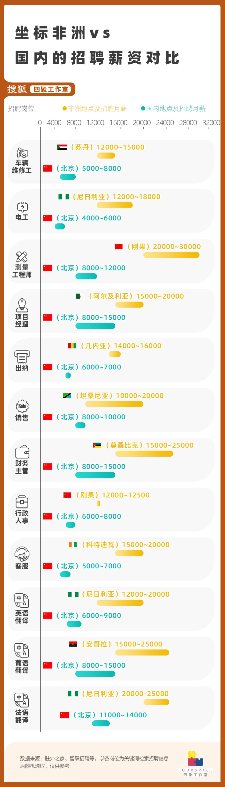 四象在面向驻外和国内工作的招聘网站上,以不同岗位为关键词检索了近期的招聘信息,发现目的地为非洲的薪资普遍都比坐标北京的更高:比如,在北京月薪为6000的电工,到尼日利亚上限立即乘了3倍;法语翻译在北京已能月入过万,但如果去到刚果,拿2.5万也不在话下。