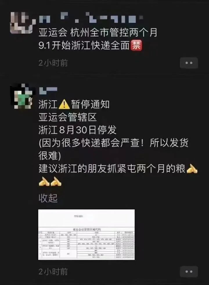 近日,关于“亚运期间浙江快递停发”的消息传播颇广,相关截图也出现在了许多人的朋友圈。但这个消息真的属实吗?